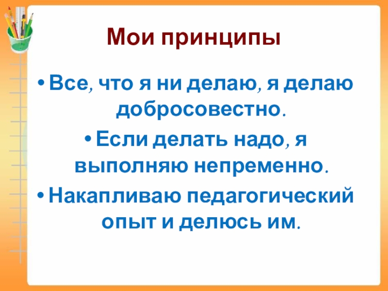 Мои принципыВсе, что я ни делаю, я делаю добросовестно.Если делать надо, я выполняю непременно.Накапливаю педагогический опыт и