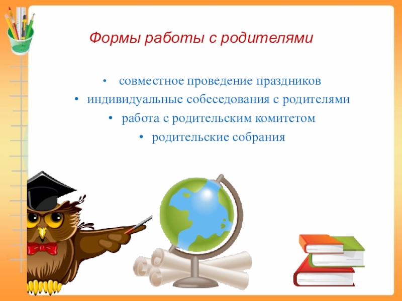 совместное проведение праздниковиндивидуальные собеседования с родителямиработа с родительским комитетомродительские собранияФормы работы с родителями