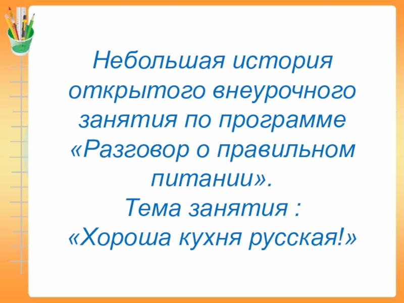 Слайд 19Небольшая история открытого внеурочного занятия по программе «Разговор о правильном питании».
