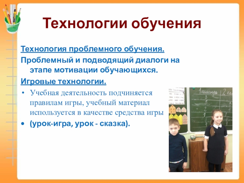 Технологии обученияТехнология проблемного обучения.Проблемный и подводящий диалоги на этапе мотивации обучающихся.Игровые технологии.Учебная деятельность подчиняется правилам игры, учебный