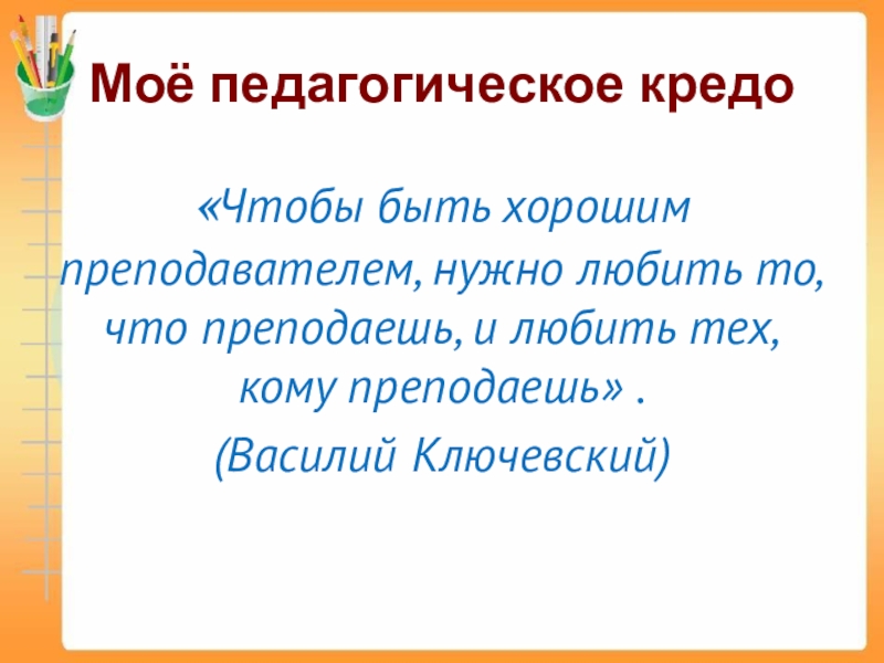 Моё педагогическое кредо«Чтобы быть хорошим преподавателем, нужно любить то, что преподаешь, и любить тех, кому преподаешь» .(Василий