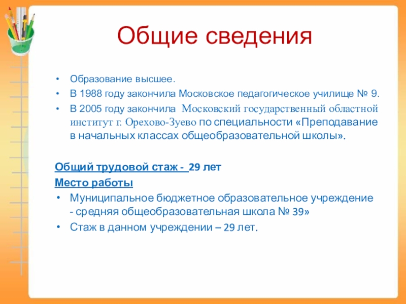 Общие сведенияОбразование высшее.В 1988 году закончила Московское педагогическое училище № 9.В 2005 году закончила Московский государственный областной