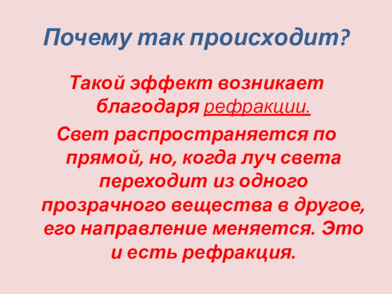 Почему так происходит?Такой эффект возникает благодаря рефракции. Свет распространяется по прямой, но, когда луч света переходит из одного