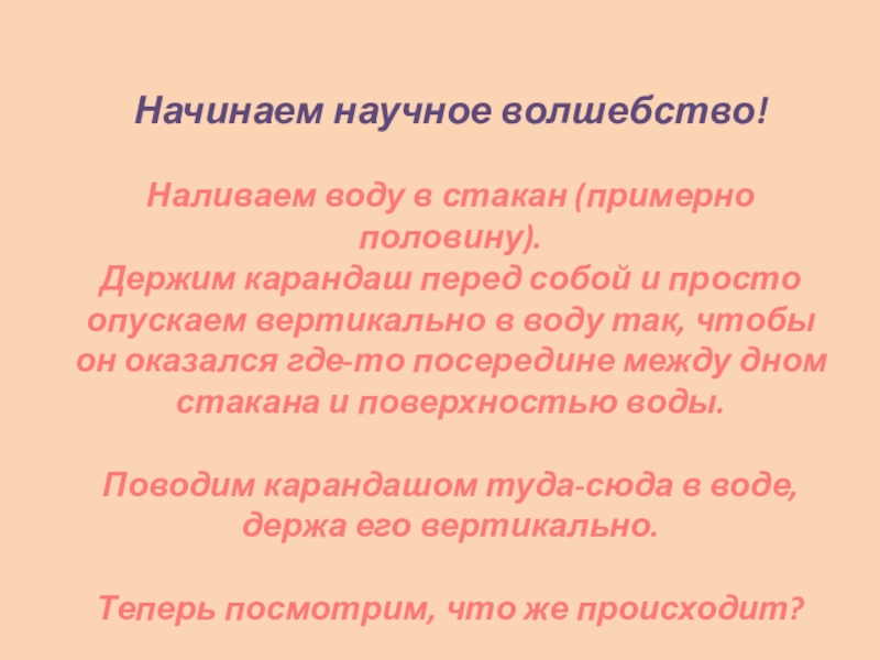 Начинаем научное волшебство!Наливаем воду в стакан (примерно половину).Держим карандаш перед собой и просто опускаем вертикально в воду