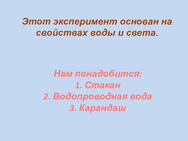 Этот эксперимент основан на свойствах воды и света.Нам понадобится:1. Стакан2. Водопроводная вода3. Карандаш