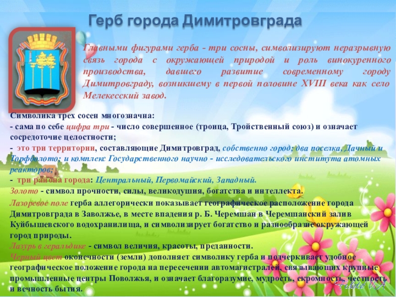Лазоревое поле герба аллегорически показывает географическое расположение города Димитровграда в Заволжье, в месте впадения р. Б. Черемшан в Черемшанский залив Куйбышевского водохранилища, и символизирует богатство и разнообразие окружающей город природы.
