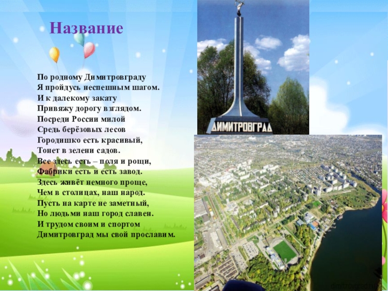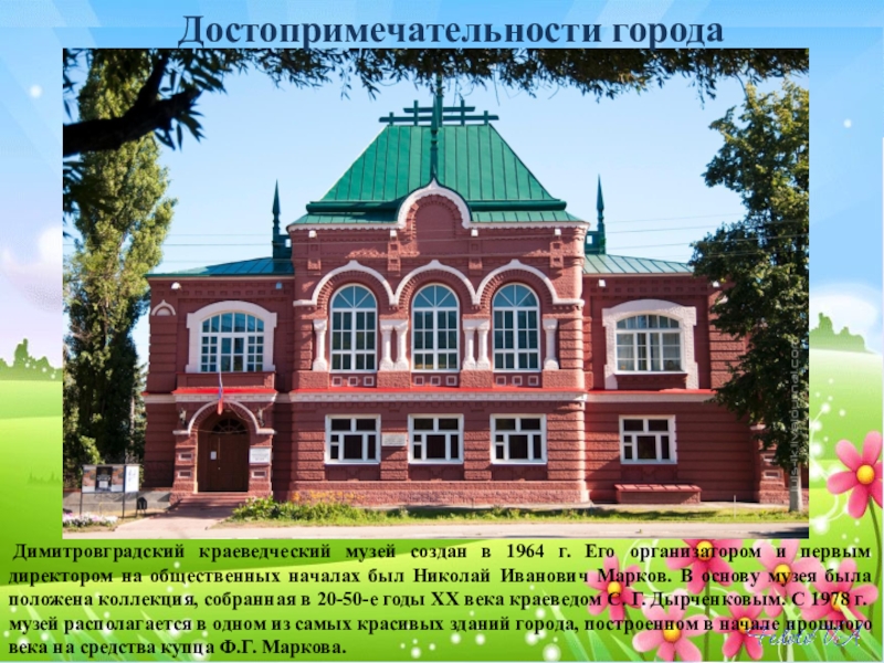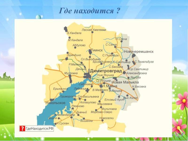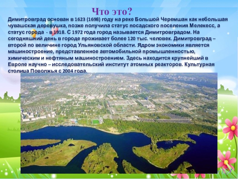 - это три территории, составляющие Димитровград, собственно город; два поселка, Дачный и Торфболото; и комплекс Государственного научно - исследовательского института атомных реакторов;