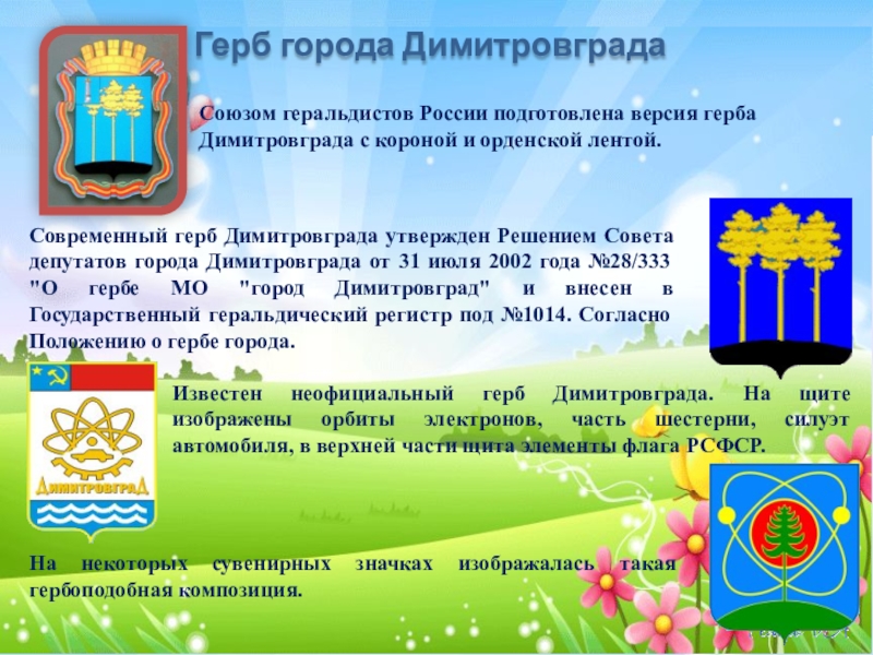 Современный герб Димитровграда утвержден Решением Совета депутатов города Димитровграда от 31 июля 2002 года №28/333 "О гербе МО "город Димитровград" и внесен в Государственный геральдический регистр под №1014. Согласно Положению о гербе города.