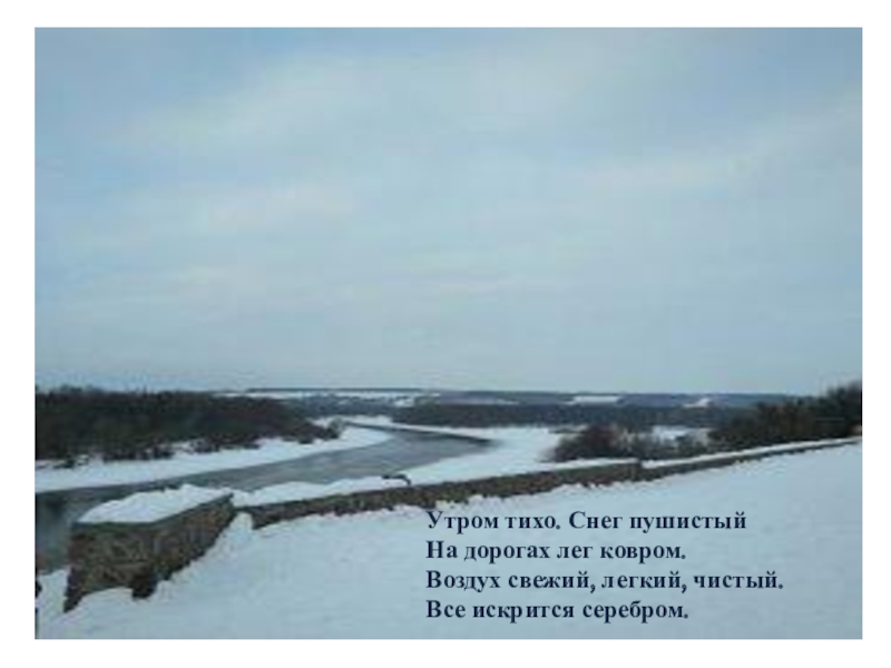 Утром тихо. Снег пушистый  На дорогах лег ковром.  Воздух свежий, легкий, чистый.  Все искрится серебром.