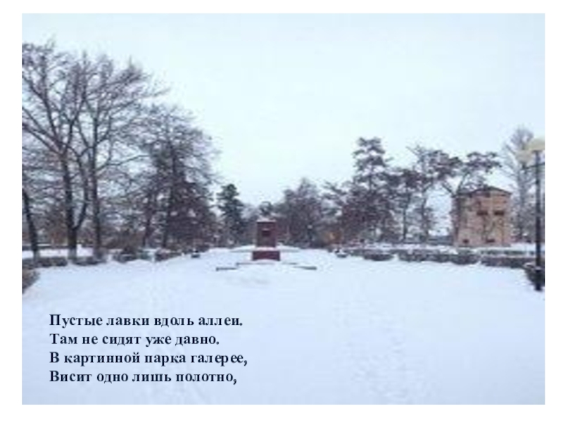 Слайд 7Пустые лавки вдоль аллеи. Там не сидят уже давно. В картинной парка галерее, Висит
