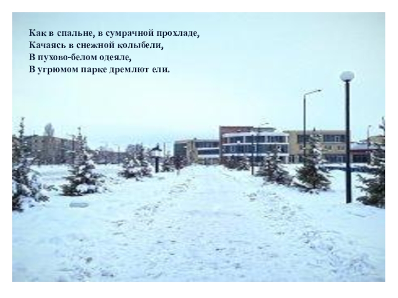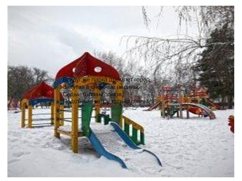 Слайд 5Вокруг же парка дремлет город, Закутав в снежные перины, Седые головы домов, Подставив ветру
