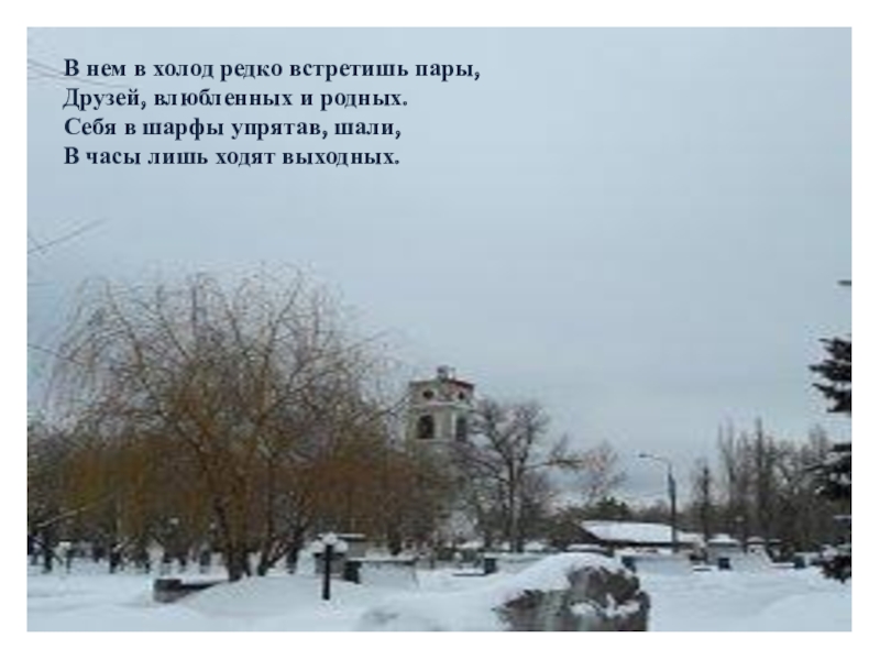 В нем в холод редко встретишь пары, Друзей, влюбленных и родных. Себя в шарфы упрятав, шали, В