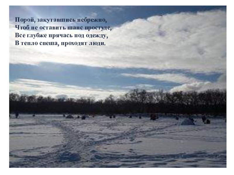 Слайд 14Порой, закутавшись небрежно, Чтоб не оставить шанс простуде, Все глубже прячась под одежду, В