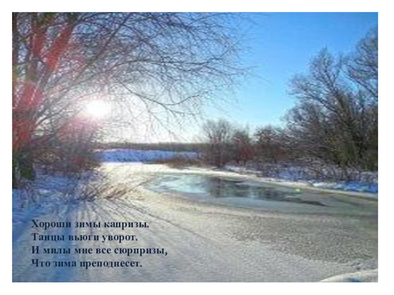 Слайд 19Хороши зимы капризы.  Танцы вьюги уворот.  И милы мне все сюрпризы,  Что зима преподнесет.