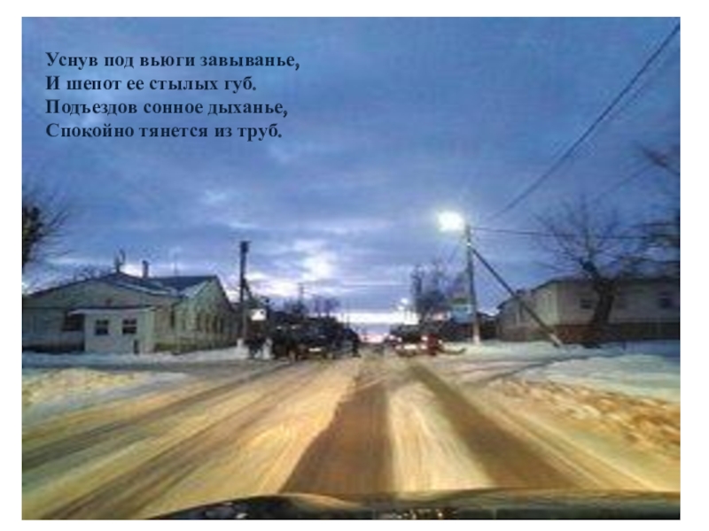 Слайд 3Уснув под вьюги завыванье, И шепот ее стылых губ. Подъездов сонное дыханье, Спокойно тянется