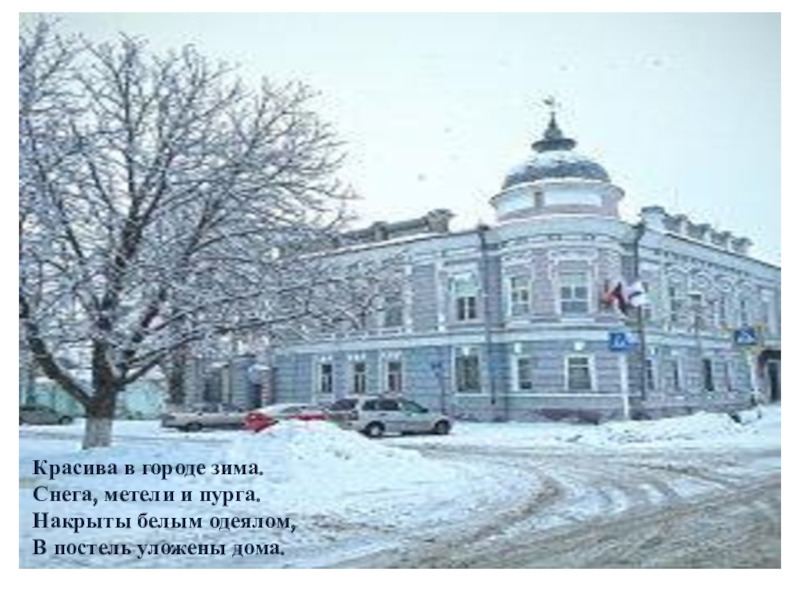 Слайд 2Красива в городе зима. Снега, метели и пурга. Накрыты белым одеялом, В постель уложены