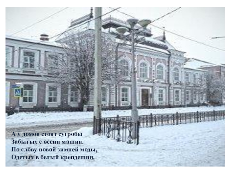 Слайд 4А у домов стоят сугробы Забытых с осени машин. По слову новой зимней