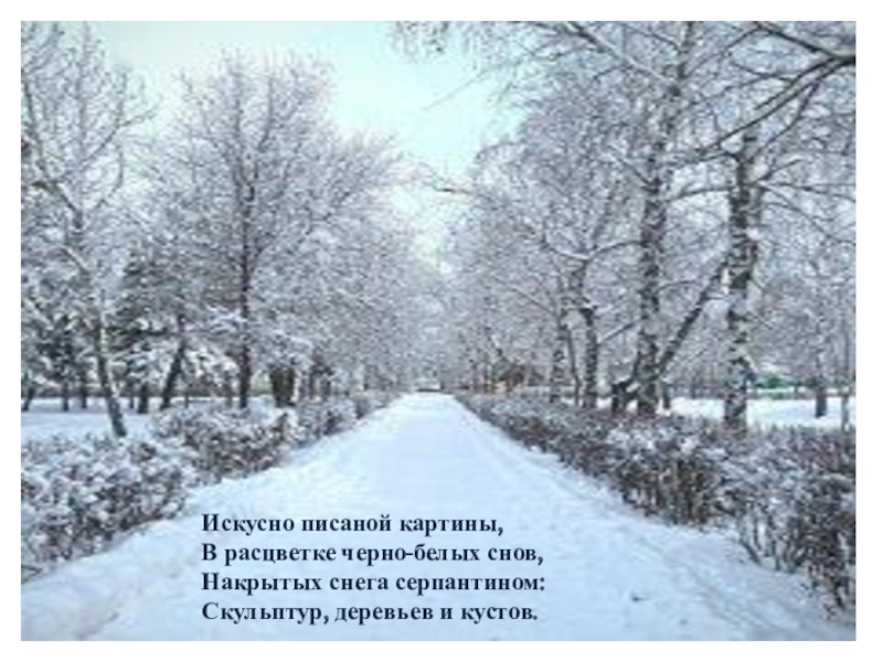 Слайд 9Искусно писаной картины,  В расцветке черно-белых снов, Накрытых снега серпантином: Скульптур, деревьев и кустов.