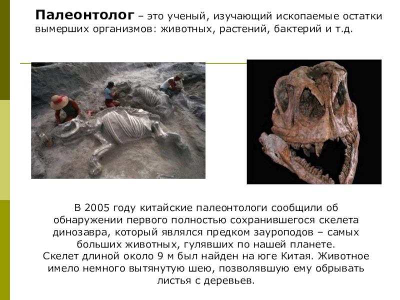 Слайд 14Палеонтолог – это ученый, изучающий ископаемые остатки вымерших организмов: животных, растений, бактерий
