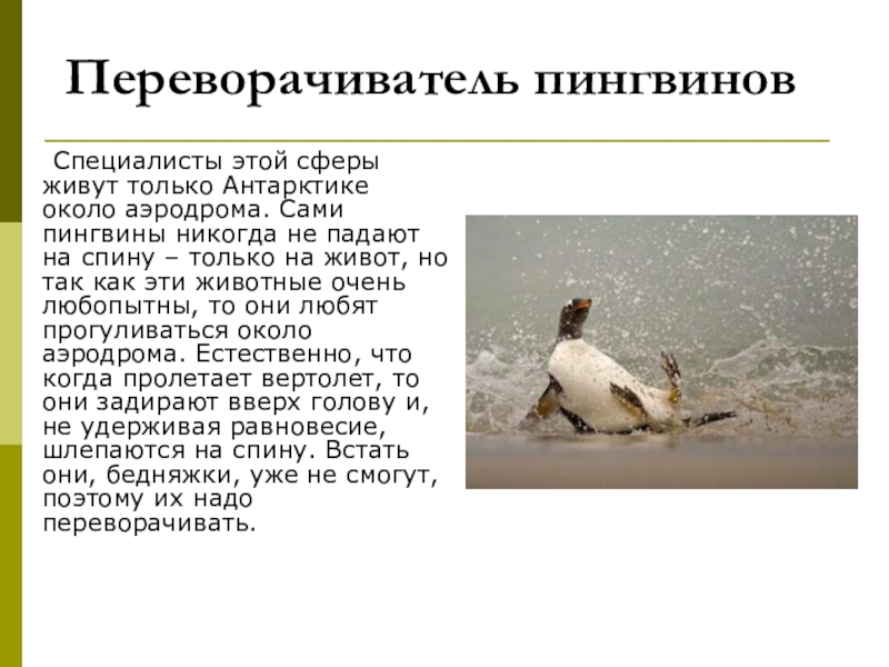 Специалисты этой сферы живут только Антарктике около аэродрома. Сами пингвины