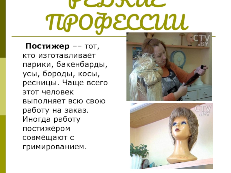 Постижер –– тот, кто изготавливает парики, бакенбарды, усы, бороды, косы, ресницы.