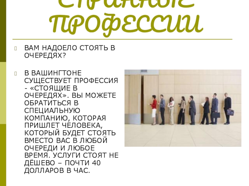 В ОЧЕРЕДЯХ». ВЫ МОЖЕТЕ ОБРАТИТЬСЯ В СПЕЦИАЛЬНУЮ КОМПАНИЮ, КОТОРАЯ ПРИШЛЕТ ЧЕЛОВЕКА, КОТОРЫЙ БУДЕТ СТОЯТЬ ВМЕСТО ВАС В ЛЮБОЙ ОЧЕРЕДИ И ЛЮБОЕ ВРЕМЯ. УСЛУГИ СТОЯТ НЕ ДЁШЕВО – ПОЧТИ 40 ДОЛЛАРОВ В ЧАС.