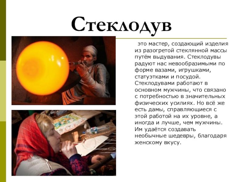 радуют нас невообразимыми по форме вазами, игрушками, статуэтками и посудой. Стеклодувами работают в основном мужчины, что связано с потребностью в значительных физических усилиях. Но всё же есть дамы, справляющиеся с этой работой на их уровне, а иногда и лучше, чем мужчины. Им удаётся создавать необычные шедевры, благодаря женскому вкусу.