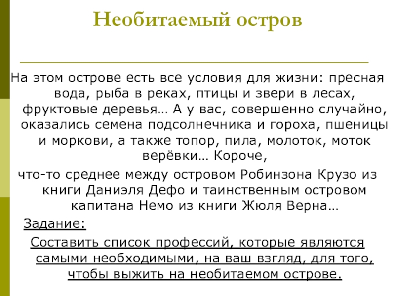 Составить список профессий, которые являются самыми необходимыми, на ваш взгляд, для того, чтобы выжить на необитаемом острове.