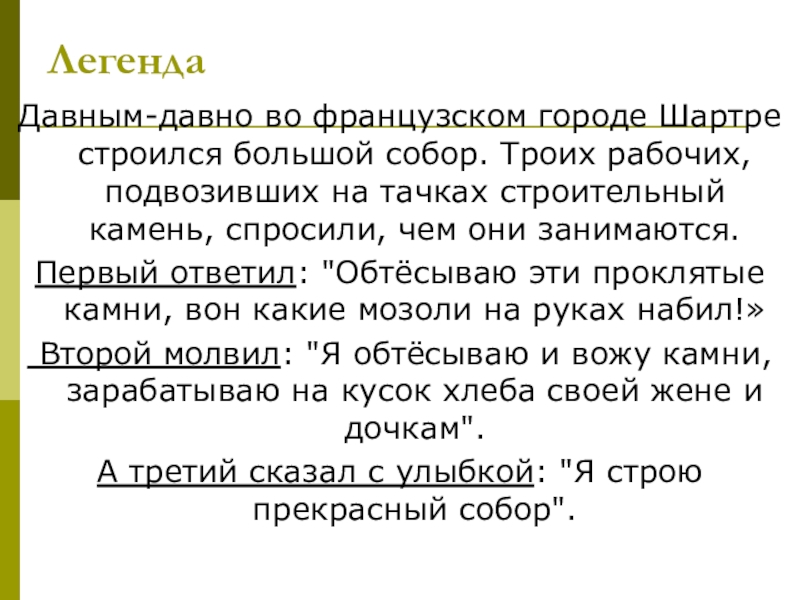Давным-давно во французском городе Шартре строился большой собор. Троих рабочих, подвозивших