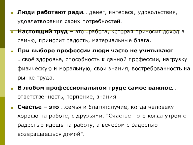Люди работают ради… денег, интереса, удовольствия, удовлетворения своих потребностей.