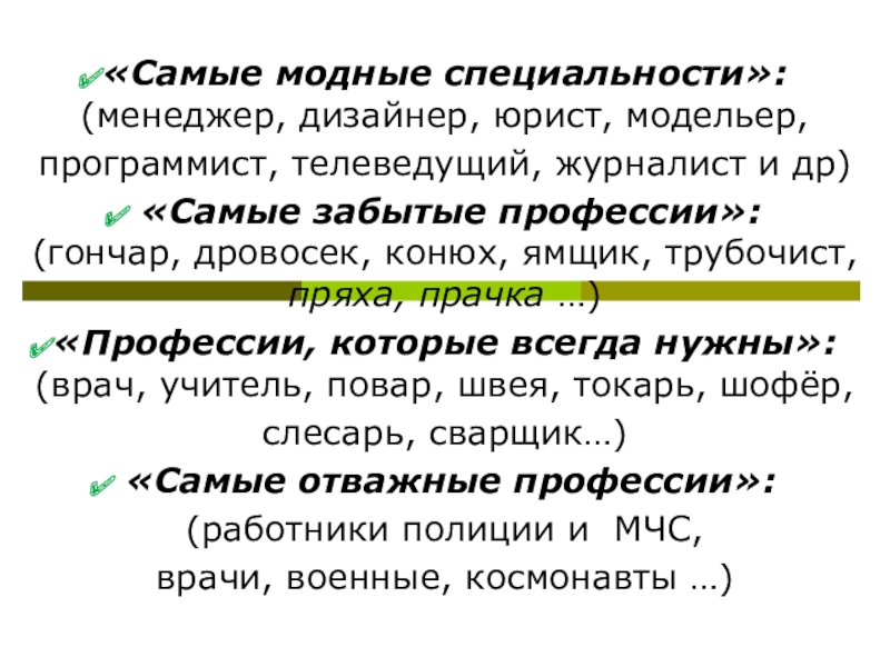 (менеджер, дизайнер, юрист, модельер,