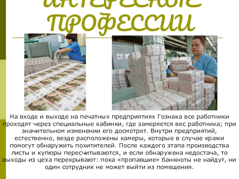 проходят через специальные кабинки, где замеряется вес работника; при значительном изменении его досмотрят. Внутри предприятий, естественно, везде расположены камеры, которые в случае кражи помогут обнаружить похитителей. После каждого этапа производства листы и купюры пересчитываются, и если обнаружена недостача, то выходы из цеха перекрывают: пока «пропавшие» банкноты не найдут, ни один сотрудник не может выйти из помещения.
