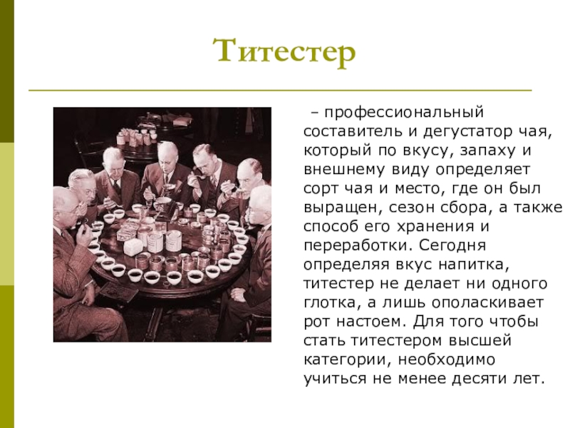 внешнему виду определяет сорт чая и место, где он был выращен, сезон сбора, а также способ его хранения и переработки. Сегодня определяя вкус напитка, титестер не делает ни одного глотка, а лишь ополаскивает рот настоем. Для того чтобы стать титестером высшей категории, необходимо учиться не менее десяти лет.