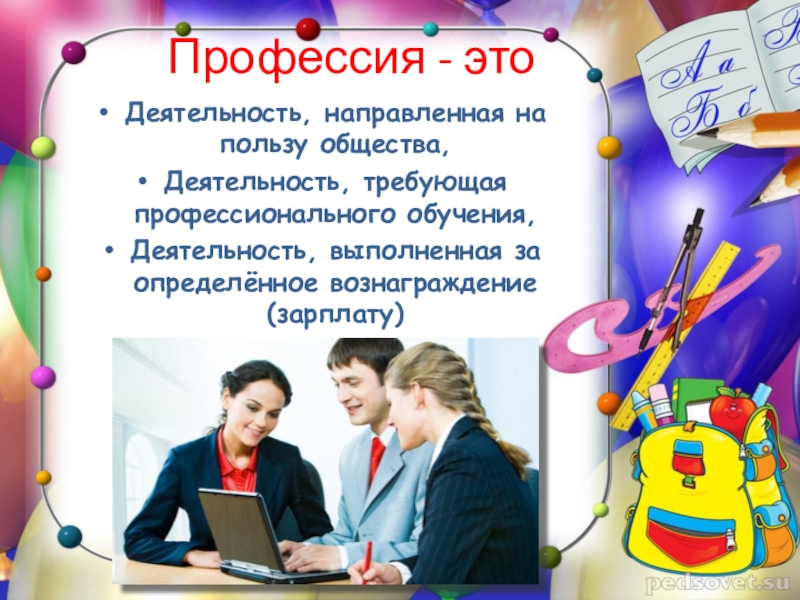 Профессия - этоДеятельность, направленная на пользу общества,Деятельность, требующая профессионального обучения,Деятельность, выполненная за определённое вознаграждение (зарплату)