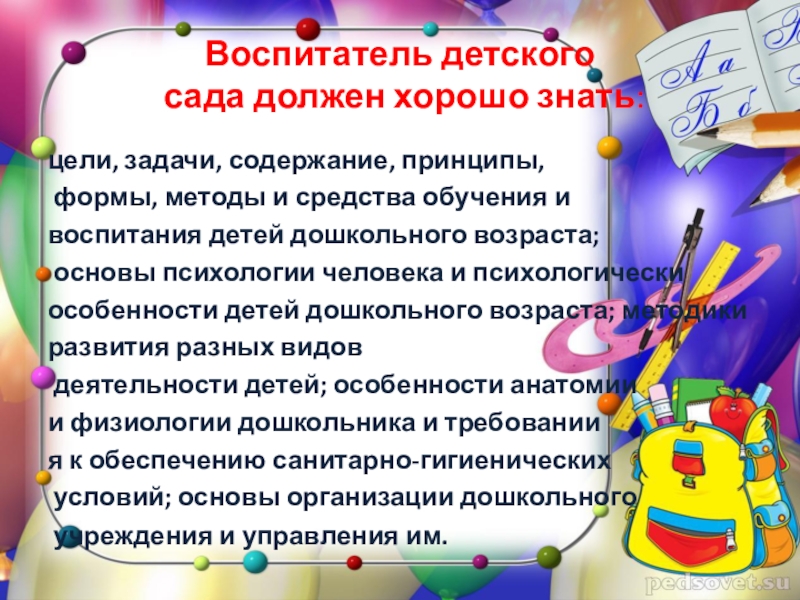 Слайд 5Воспитатель детского сада должен хорошо знать: