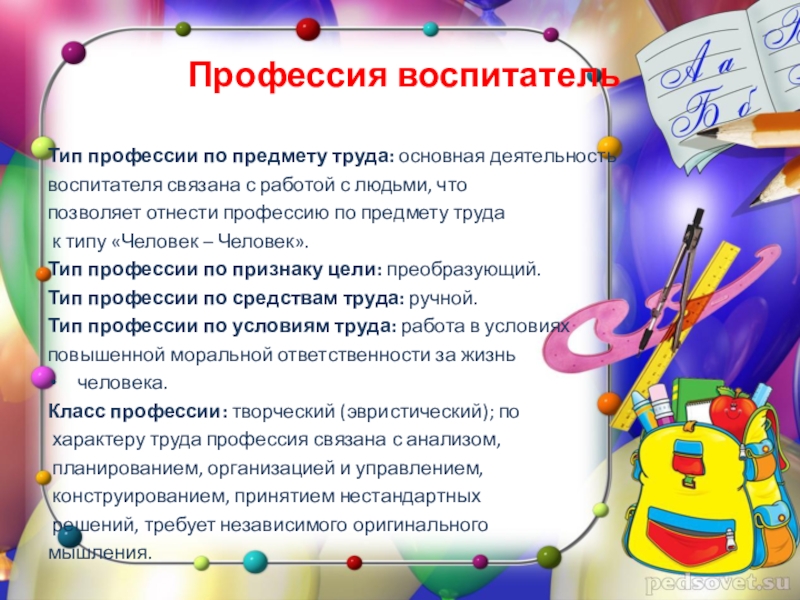 Профессия воспитатель Тип профессии по предмету труда: основная деятельность воспитателя связана с работой с людьми,