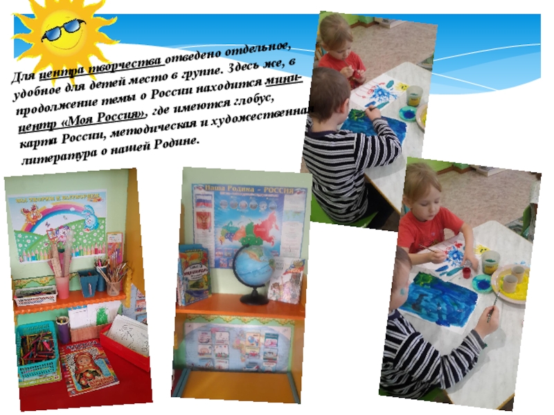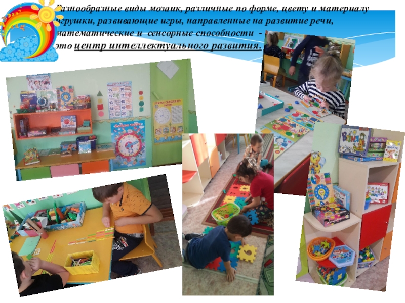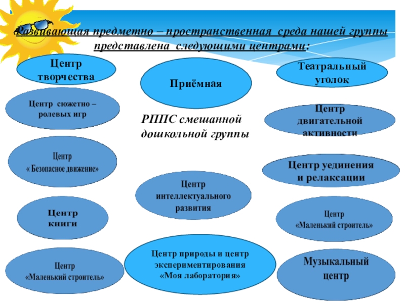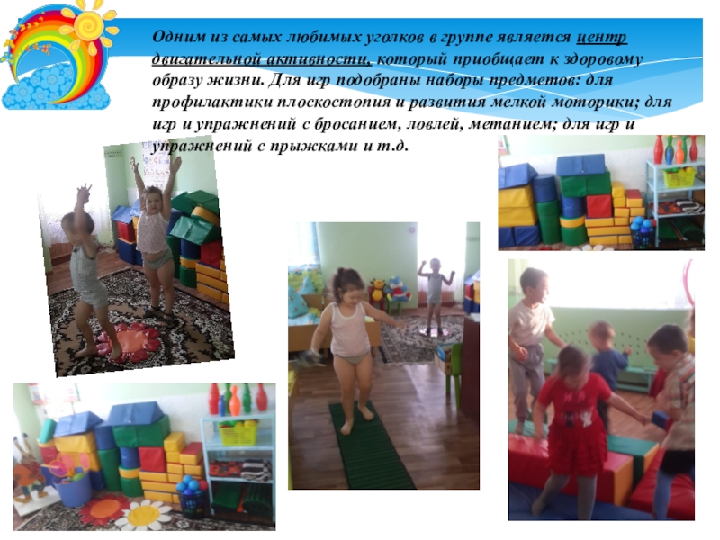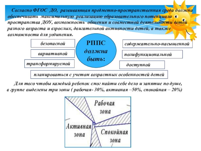 Для того чтобы каждый ребенок смог найти себе дело и занятие по душе, в группе выделены три зоны ( рабочая- 30%, активная –50%, спокойная – 20%)