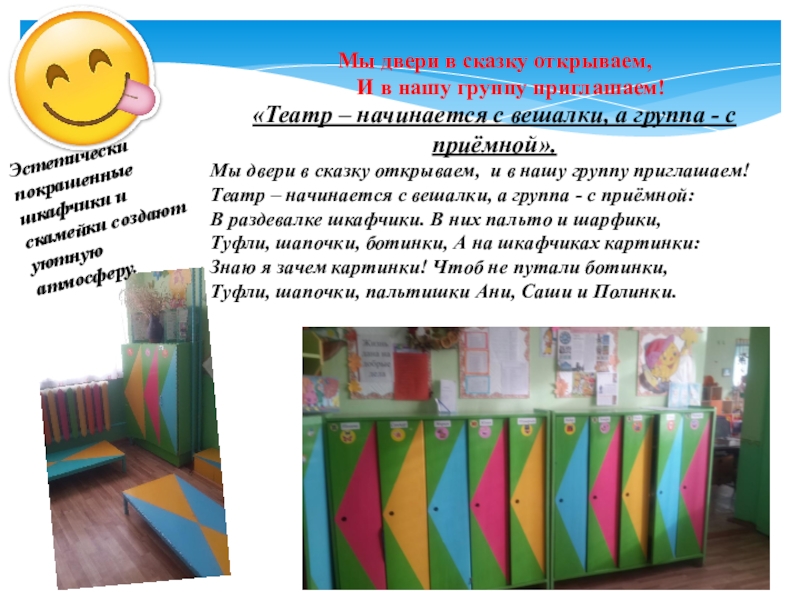 Эстетически покрашенные шкафчики и скамейки создают уютную атмосферу.
