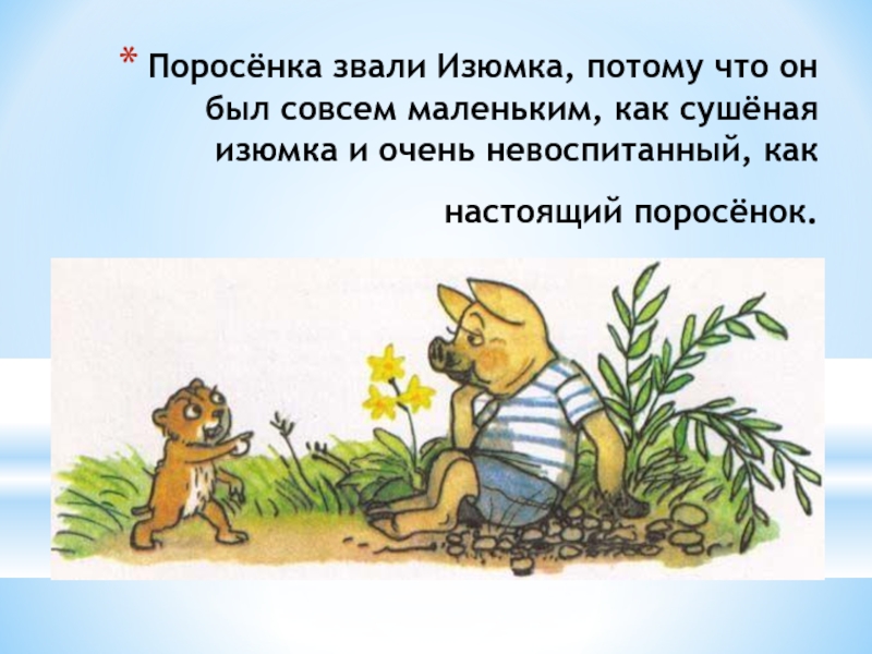 Слайд 4Поросёнка звали Изюмка, потому что он был совсем маленьким, как сушёная