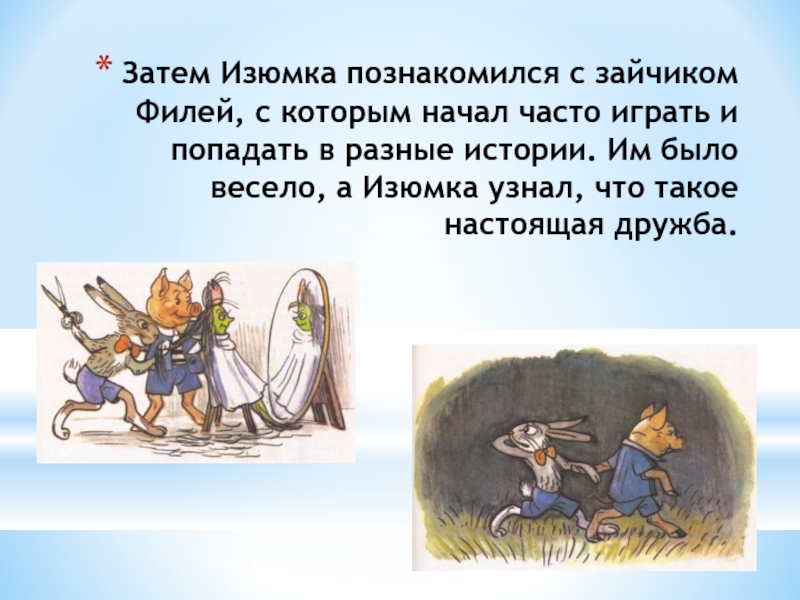 Слайд 7Затем Изюмка познакомился с зайчиком Филей, с которым начал часто играть