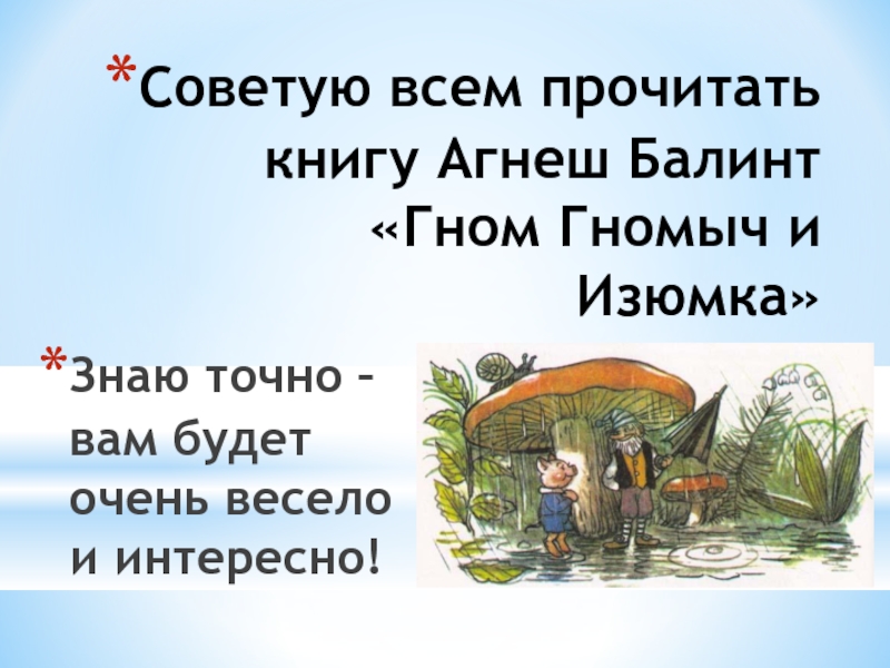 Слайд 12Советую всем прочитать книгу Агнеш Балинт «Гном Гномыч и Изюмка»