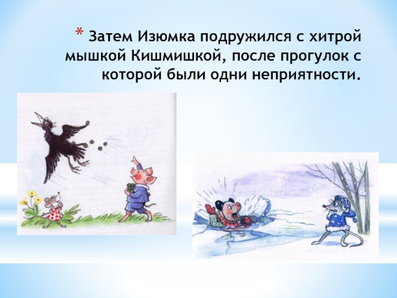 Слайд 8Затем Изюмка подружился с хитрой мышкой Кишмишкой, после прогулок с которой