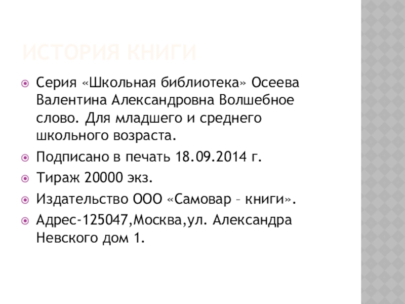 История книгиСерия «Школьная библиотека» Осеева Валентина Александровна Волшебное слово. Для младшего и среднего школьного возраста.Подписано в печать