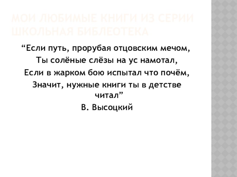 Мои любимые книги из серии школьная библеотека“Если путь, прорубая отцовским мечом, Ты солёные слёзы на ус намотал, Если в жарком бою испытал что почём, Значит, нужные книги ты в детстве читал” В. Высоцкий