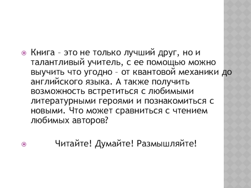 Слайд 15Книга – это не только лучший друг, но и талантливый учитель,