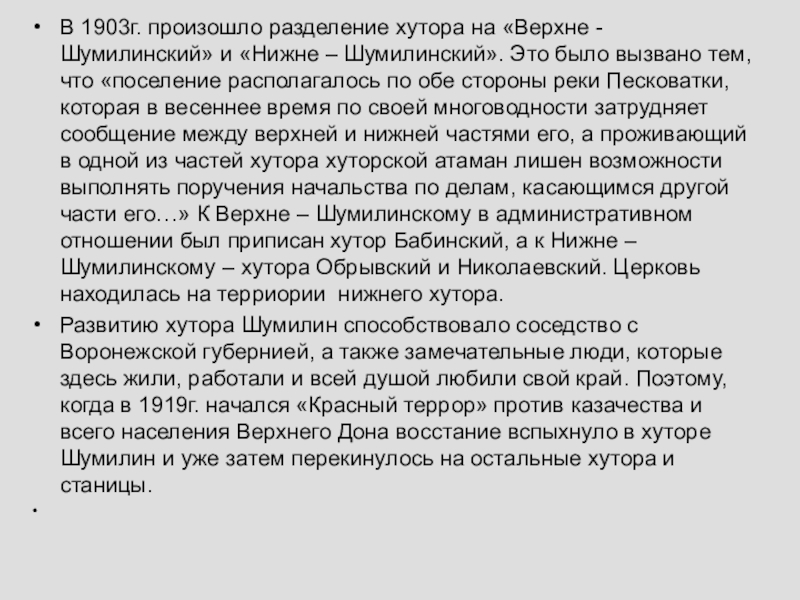Слайд 5В 1903г. произошло разделение хутора на «Верхне - Шумилинский» и «Нижне