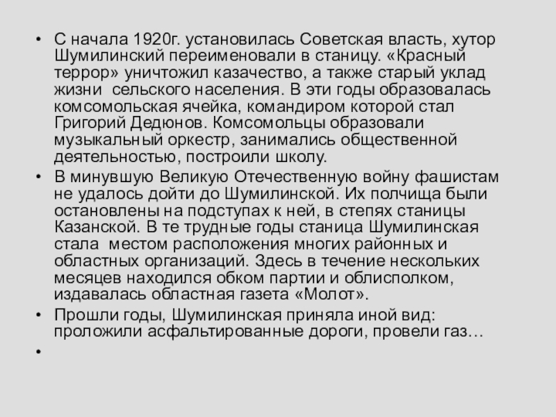 Слайд 6С начала 1920г. установилась Советская власть, хутор Шумилинский переименовали в станицу.