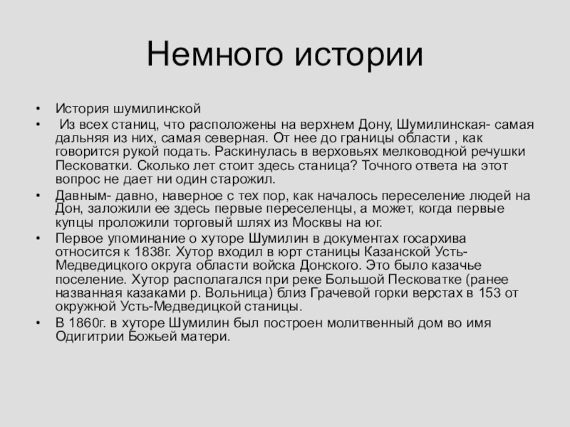 Немного историиИстория шумилинской Из всех станиц, что расположены на верхнем Дону, Шумилинская- самая дальняя из них, самая северная.