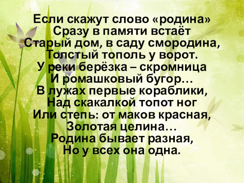 Если скажут слово «родина» Сразу в памяти встаёт Старый дом, в саду смородина, Толстый тополь у ворот. У реки берёзка – скромница И ромашковый бугор… В лужах первые кораблики, Над скакалкой топот ног Или степь: