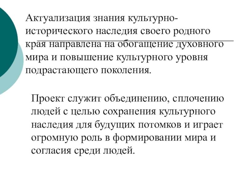 Проект служит объединению, сплочению людей с целью сохранения культурного наследия для будущих потомков и играет огромную роль в формировании мира и согласия среди людей.